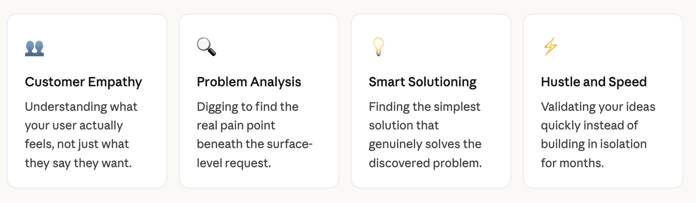 Notice the trap here. You can have three out of four and still fail. A user tells you they want an export button. You build it fast and it looks great. But did it solve their real problem? You showed empathy, solutioning, and hustle but you skipped problem analysis. That is not product thinking.