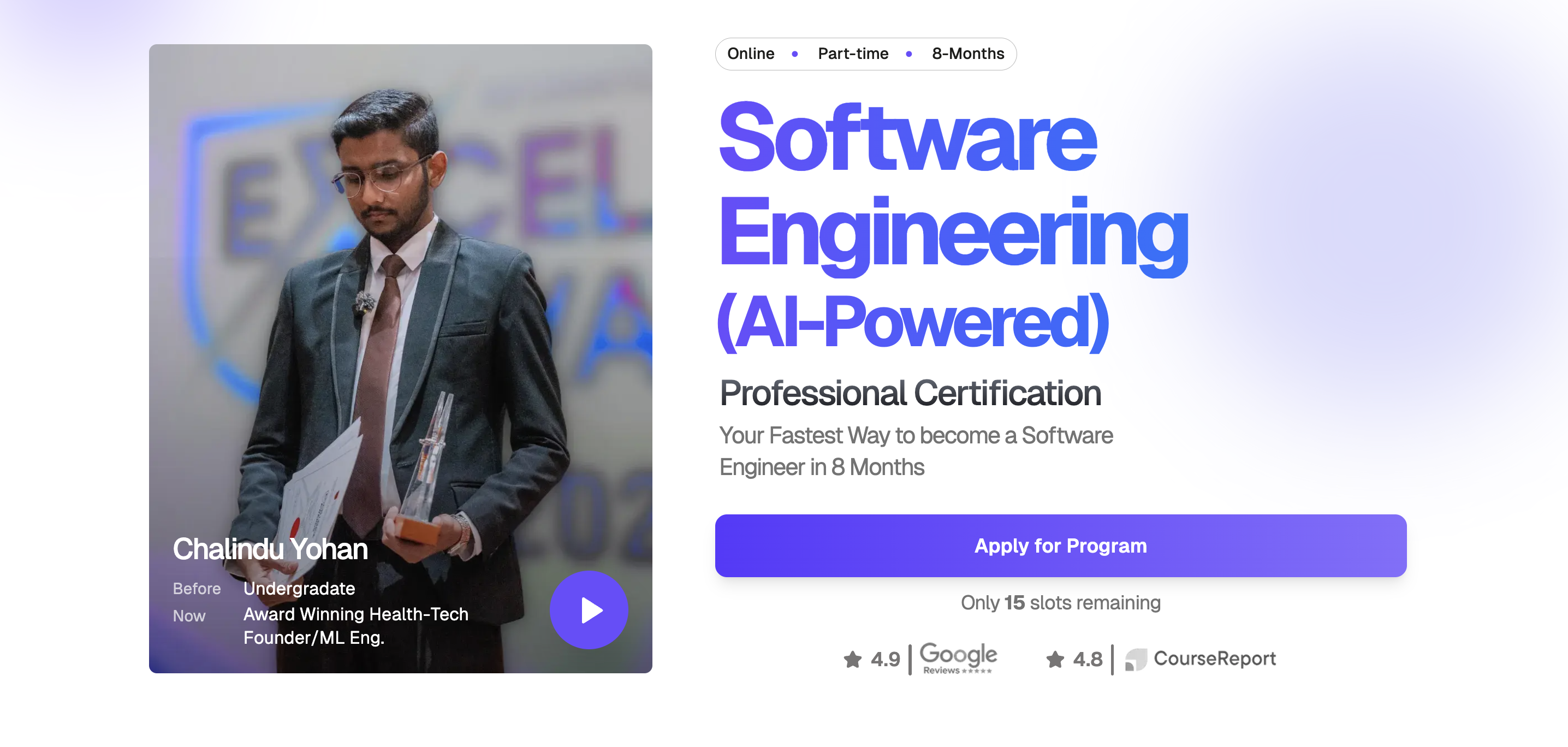 It's 8 months of intensive mentorship from 20+ working industry professionals: CTOs coaching you in building Industry Grade products, senior engineers reviewing your projects, tech leads guiding your externships, and career coaches preparing you for interviews.